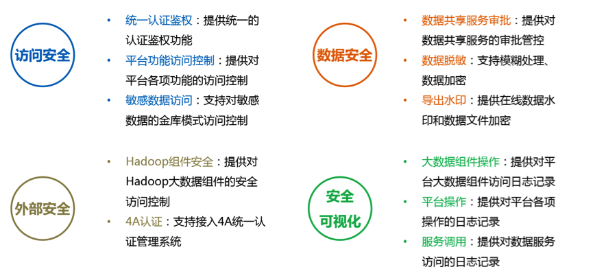 平台从访问安全、数据安全、外部安全、安全可视化等方面提供全方位的安全管控能力。