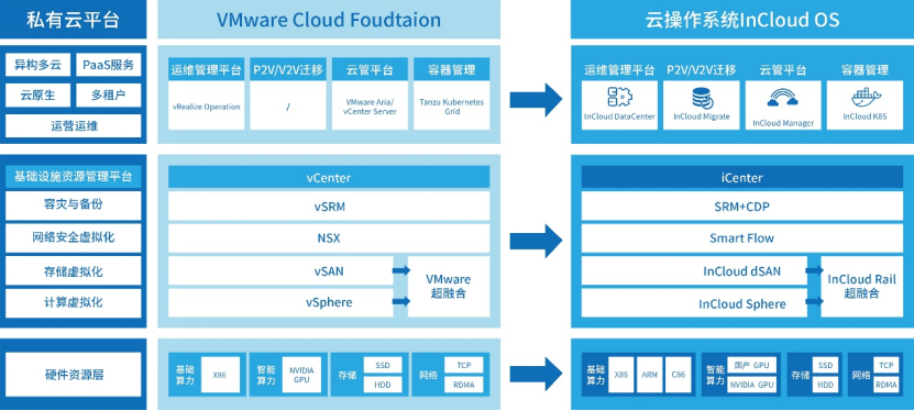 - 智能高效,统一运营运维:异构云平台统一纳管,实现VMware便捷运维,统一管理,云资源自动调度,应用级异构编排,租户运营,计量计费,流程管理。