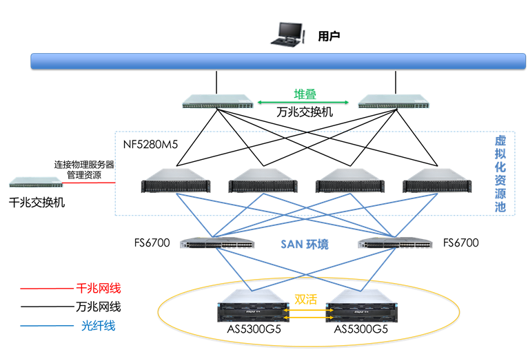 另外配置多台NF5280M5,搭配浪潮ICS虚拟化软件构建平台资源池,通过管理节点集中管理虚拟化数据中心的所有虚拟机,同时将原有设备进行利旧,纳入计算节点,并联通底层存储映射虚拟化集群中的所有主机,均衡分配存储资源。